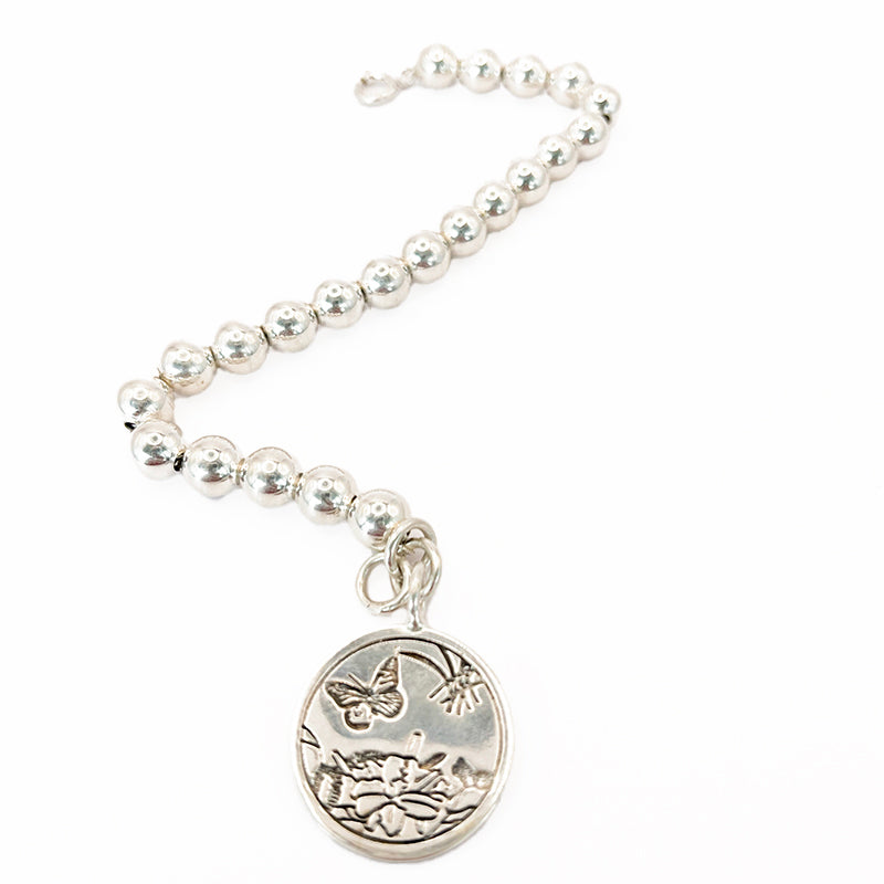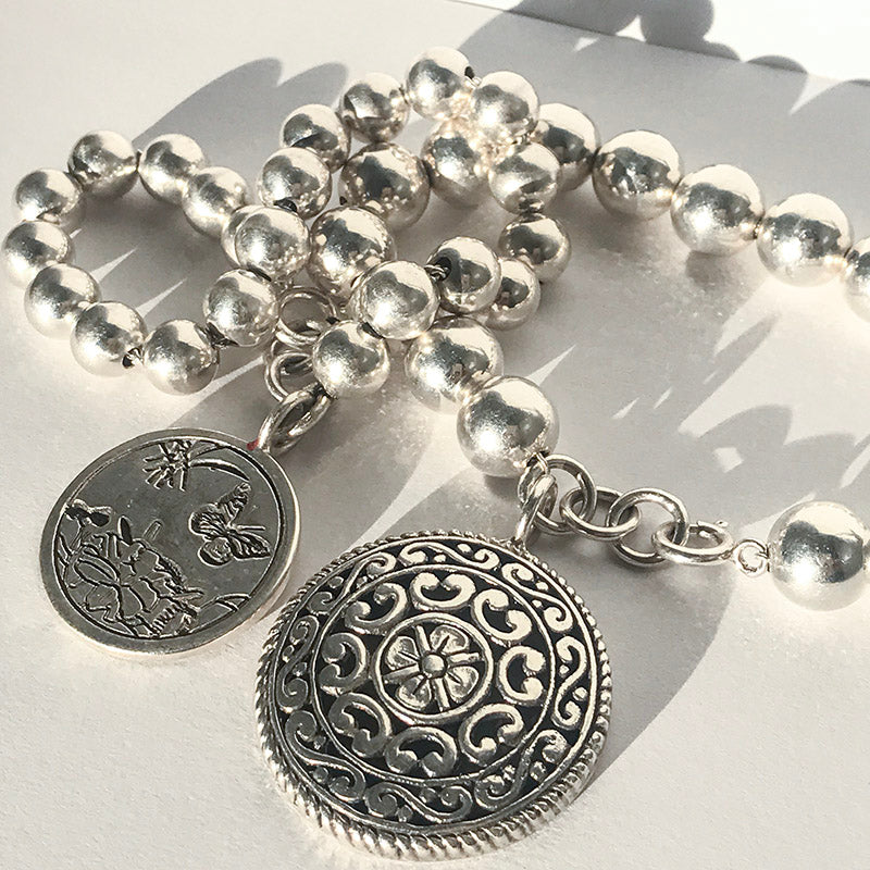 Each 8mm bead of our Sterling Silver beaded bracelet is meticulously handcrafted, infused with the artistry and expertise that have evolved over generations. These beauties have 3 different sizes with a silver clasp to secure around your wrist, positioned next to the disk for an elegant look. The length of the bracelet is 18cm and the disk is 2.5cm in diameter, weighing 24g of silver, with beads held with silver thread.