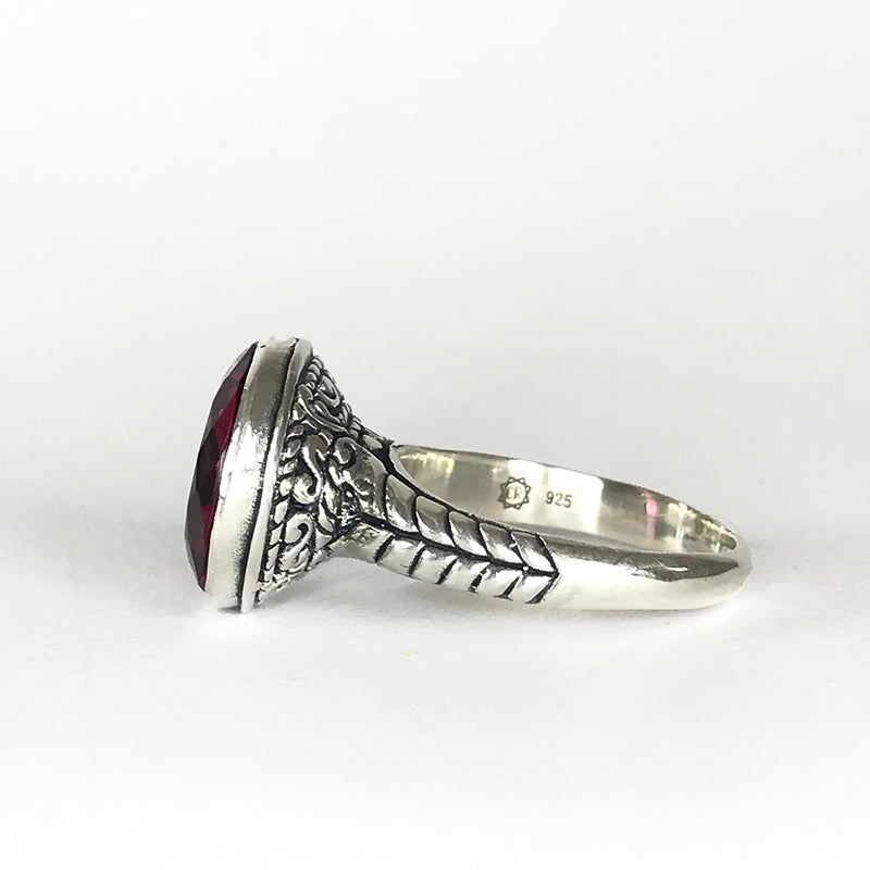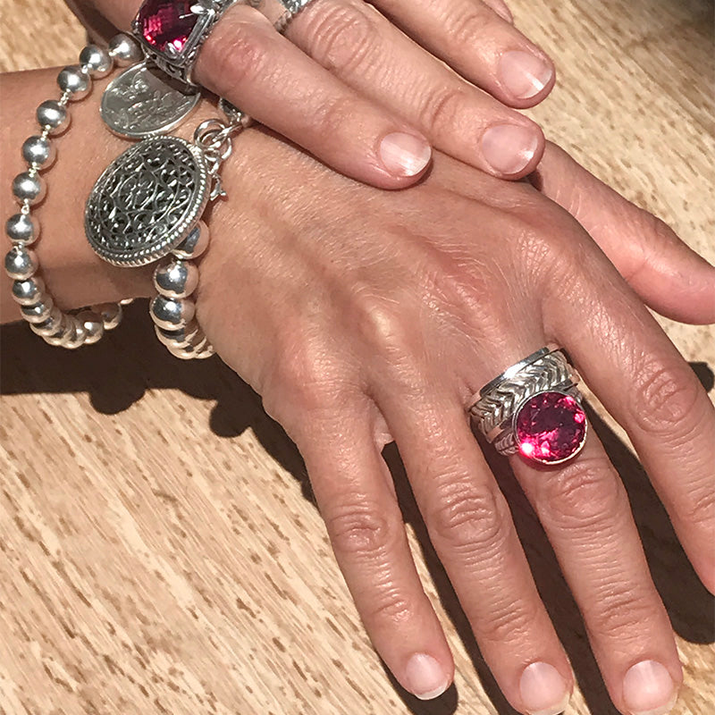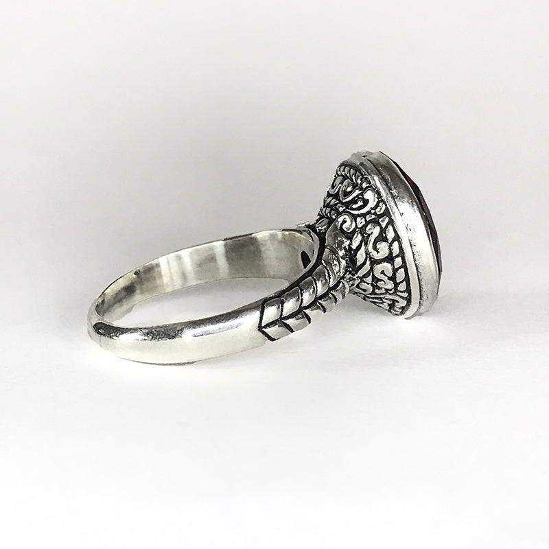 Crafted from sterling silver, the ring boasts a meticulously detailed band that reflects Aphrodite's graceful charm. The vibrancy of this gemstone evokes emotions of tenderness and warmth, much like the goddess's embrace. The stone including the bezel is 15mm in diameter.