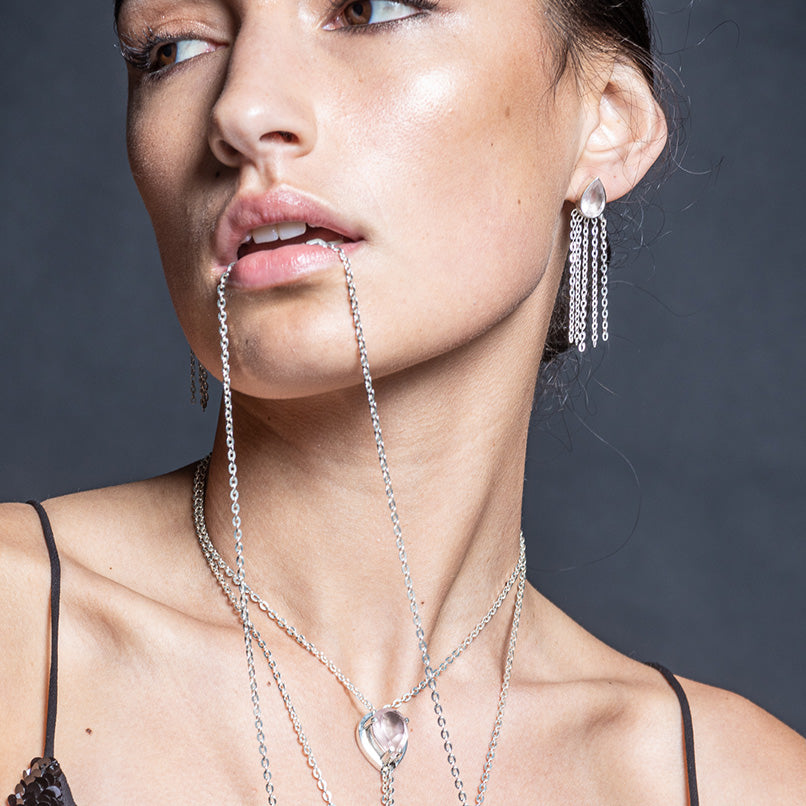 The polished finish reflects her luminous radiance, infusing every movement with an aura of confidence and purpose. The widest part of the clear quartz is 8mm and the total length of the earring is 55mm.